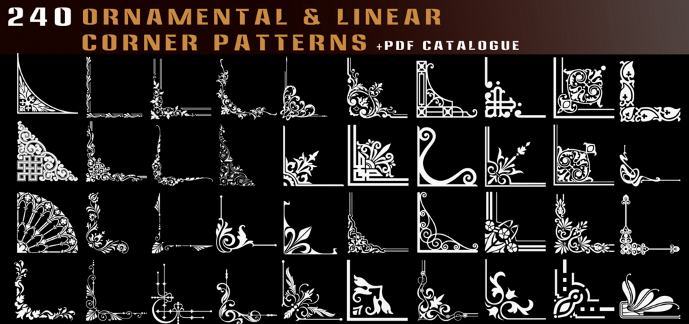 Here is a set of 240 Various 4k PNG ornamental and linear corner patterns (with black background).